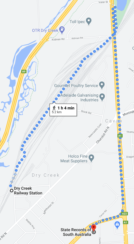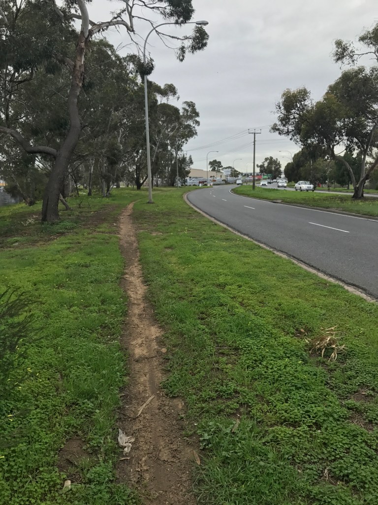 Yep, the footpath runs out. Now, you can keep going (don’t worry, you don’t end up on the motorway), and it’s not as unpleasant as the footpath-less walk to State Records of South Australia that I describe below. But for those of you with limited mobility, that’s cold comfort. Google Maps does suggest a couple of other routes that take only a couple of minutes longer, but I haven’t taken them to check if the whole route is paved. Plus, once you get to the train, you’ve still got an all-stops journey back to the city.