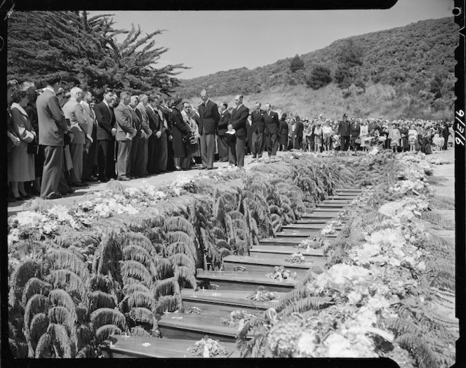 21 unidentifiable bodies were buried in a mass grave at Karori Cemetery, Wellington, on 31 December 1953. The Duke of Edinburgh left the royal tour in Hamilton and flew to Wellington to present a wreath during the ceremony on behalf of himself and the Queen. 13 of these bodies were later identified and five reburied elsewhere, so the grave now contains 16 victims. Eight are named. The other eight, in the words of their plaques, are “known unto God”.