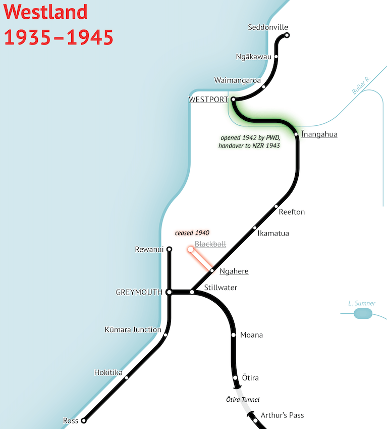 New Zealand’s railway network was a common carrier in 1920. It carried all passengers and goods offering. The problem was, on most rural lines, trains were slow “mixed” services: they carried passengers and goods together, with lengthy shunting at stations along the way. The rise of the motorcar meant that rail retreated from the countryside. But this did not need to mean the demise of most of the network: during the 1940s, the intercity and long-distance network reached its maximum extent. Buller, Gisborne, and Marlborough, for so long isolated from the nation, now enjoyed rail connections to major cities.